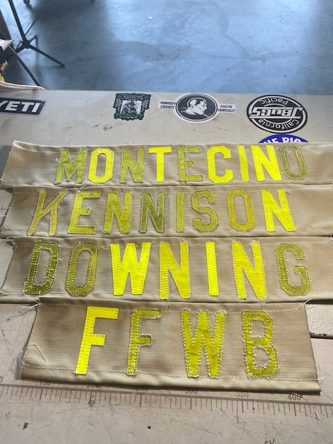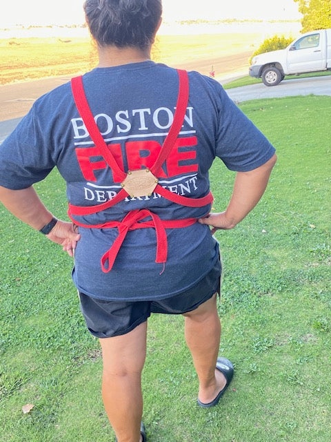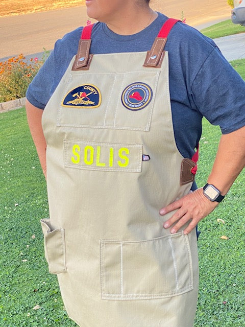 Elevate your culinary experience with our unique, handcrafted Firefighter Apron. This one-of-a-kind apron features distinctive leather accents and can be customized with your name or department's initials. Handmade from safe, clean cotton fabric, the tan color mirrors the look and feel of a real turnout coat worn by Fire Fighters (please note, they are not fireproof).