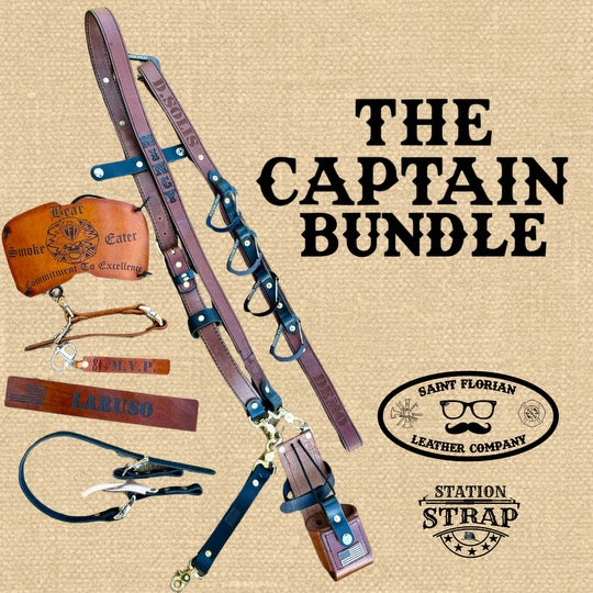 The Captain is our largest premium bundle designed to provide firefighters with essential, high-quality equipment. This set includes one of our Leather Glove Holders, one Leather Station Strap, one personalized Locker Name Plate, one Leather Chin Strap, one Custom-made MSA G1 Mask Cover, one Radio Harness, and one SCBA Quick Release. Perfect for both seasoned firefighters and new academy recruits, this comprehensive set ensures you are well-equipped and organized on every shift.