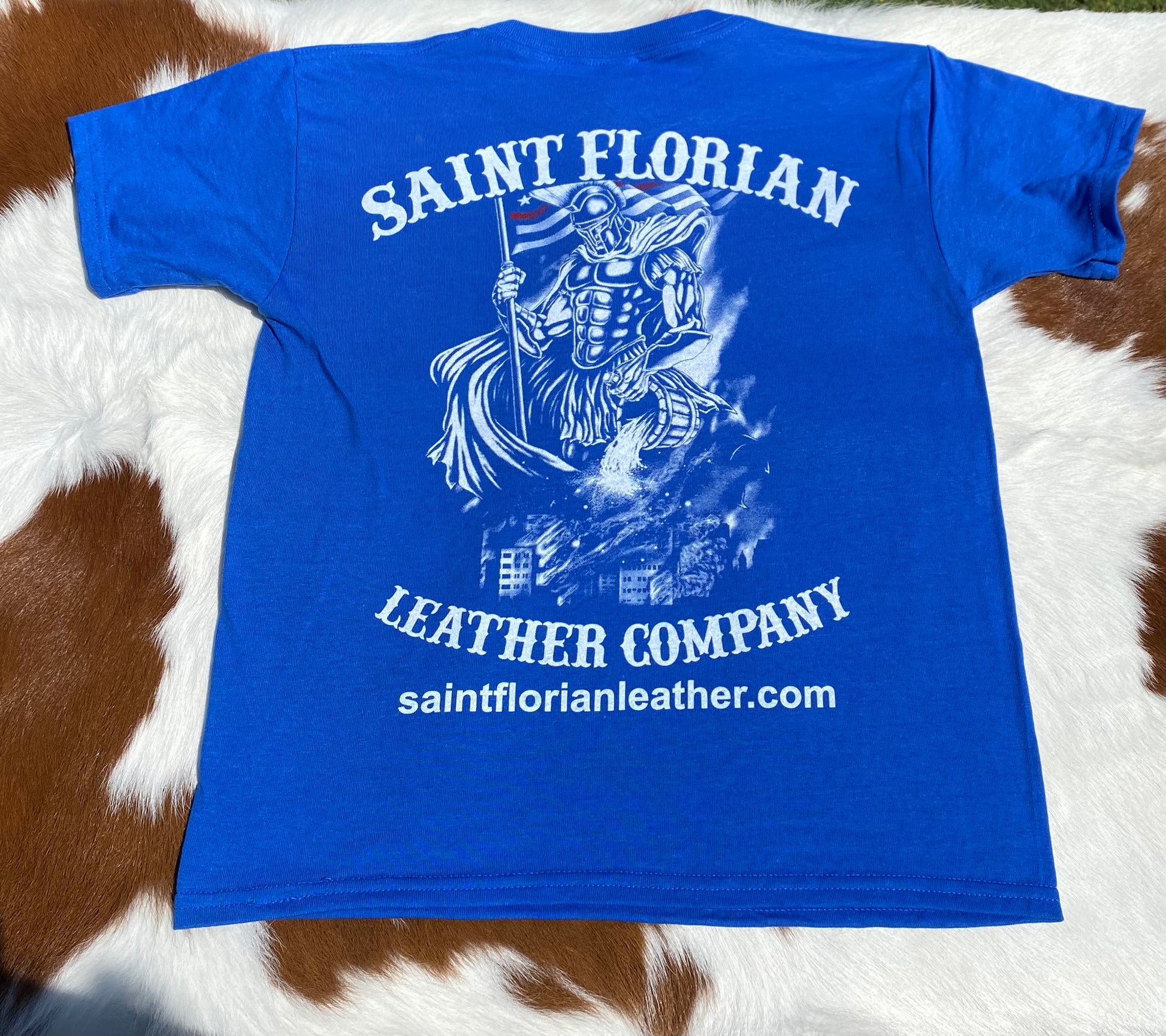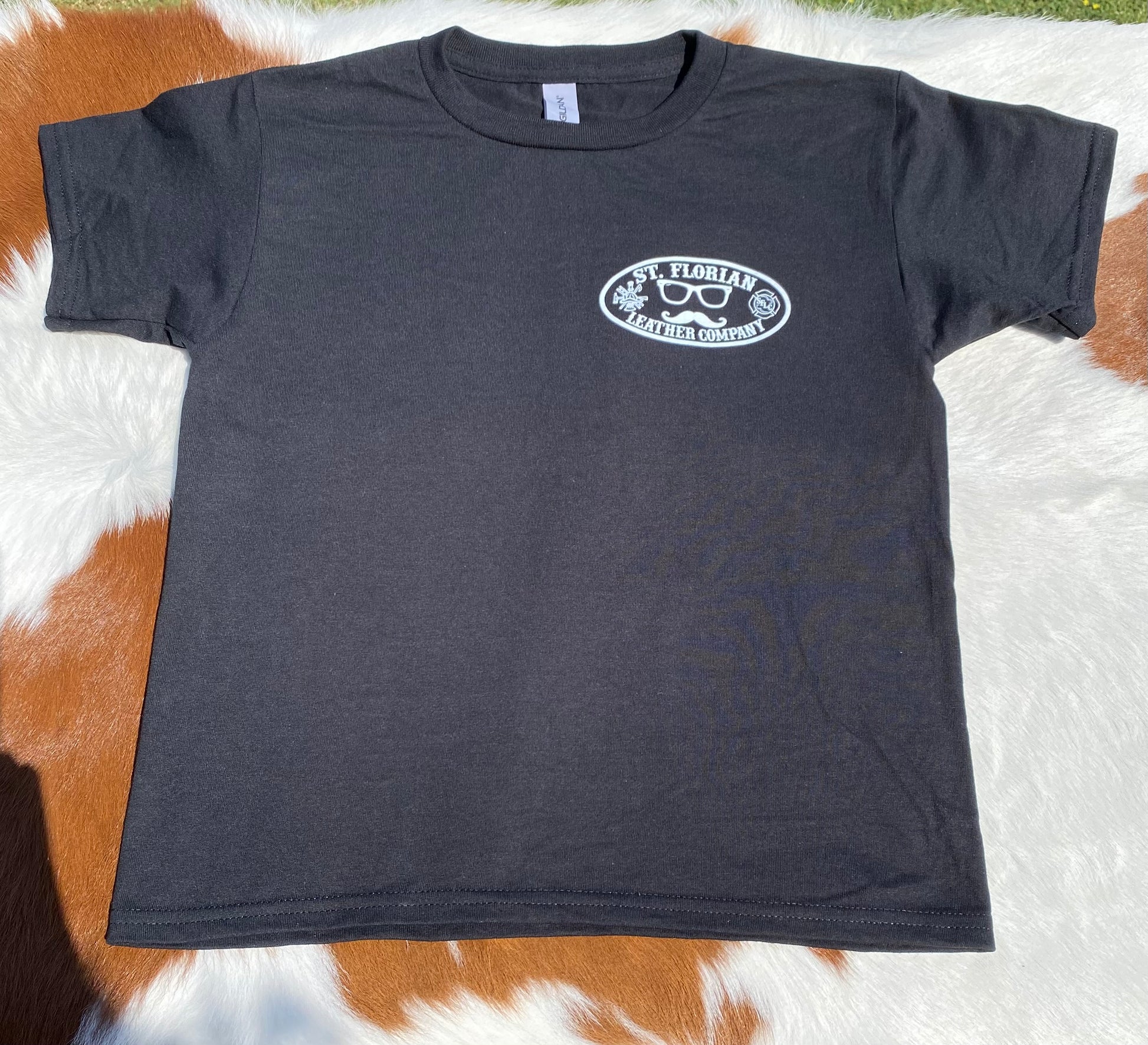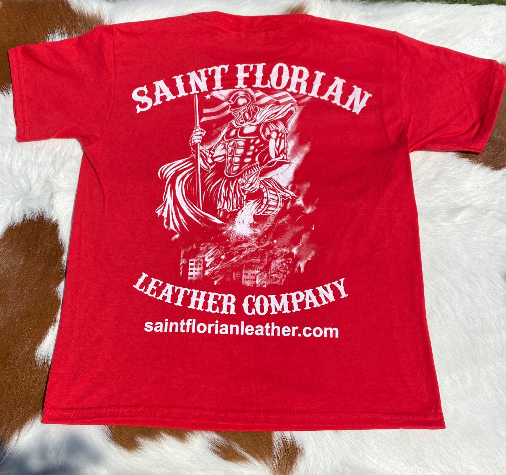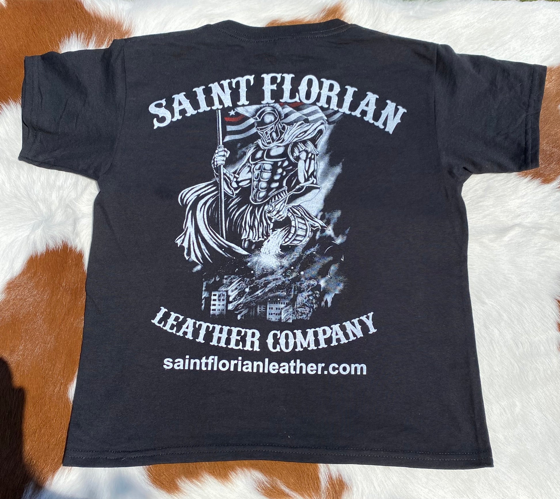 For our Saint Florian Crew Kids, Introducing the Saint Florian Leather Company's latest emblem, a tribute to the Patron Saint of Firefighters. Embrace the strength and resilience of Saint Florian with our upgraded logo, now available on the classic Gildan 100% Cotton unisex shirt.